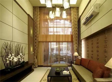 “云想衣裳花想容,春风拂槛露华浓”。中式风格注重格局以及气势,所以无论是头顶还是脚下,都必须是稳重大气占主导。古朴典雅的中式吊灯弥补着上层空间的单调感,搭配新中式的家具可谓锦上添花,荷叶花纹的壁画格外的新颖,透明的纱窗让客厅充满神秘之感,整个空间给人一种静谧而又沉稳的感觉。