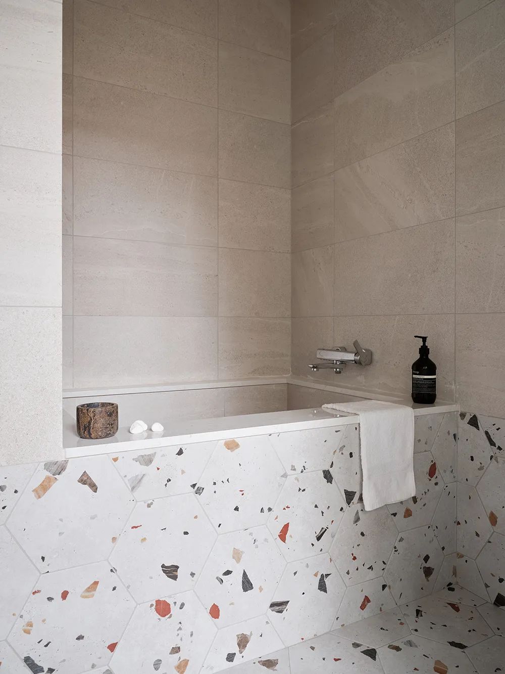 客厅是木质地板,餐厨区铺瓷砖,以此分隔空间。