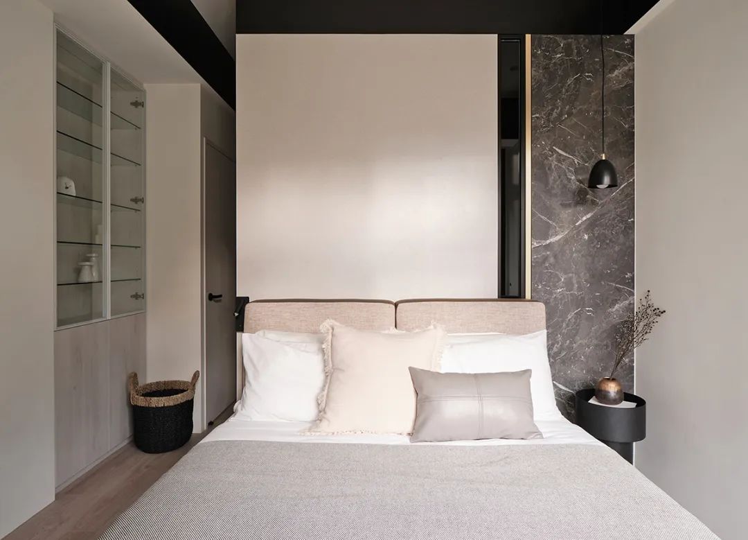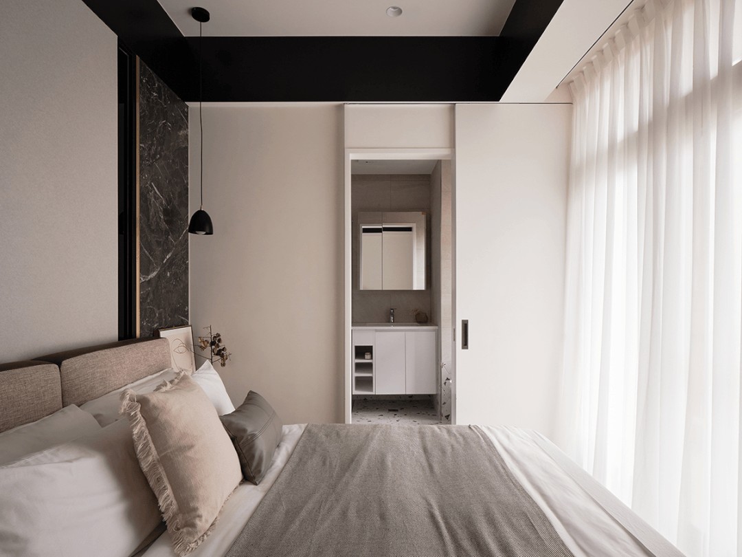 考虑到原始房门在走廊尽头,缺少隐私性,于是调动了门洞位置,同时筑起一面床头墙,隔出专属更衣间。