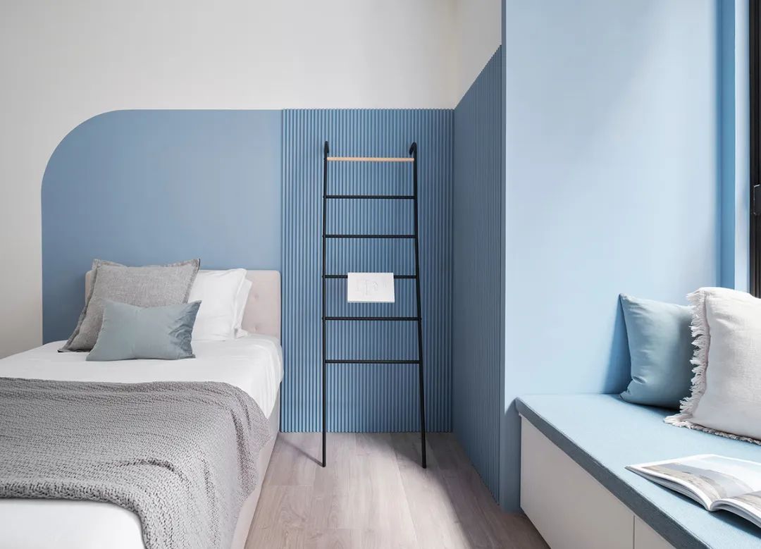 次卧以小女儿喜爱的天蓝色为基底,营造活泼氛围,外加圆弧曲线、淡蓝色百叶窗,卧室更加清爽、明快。