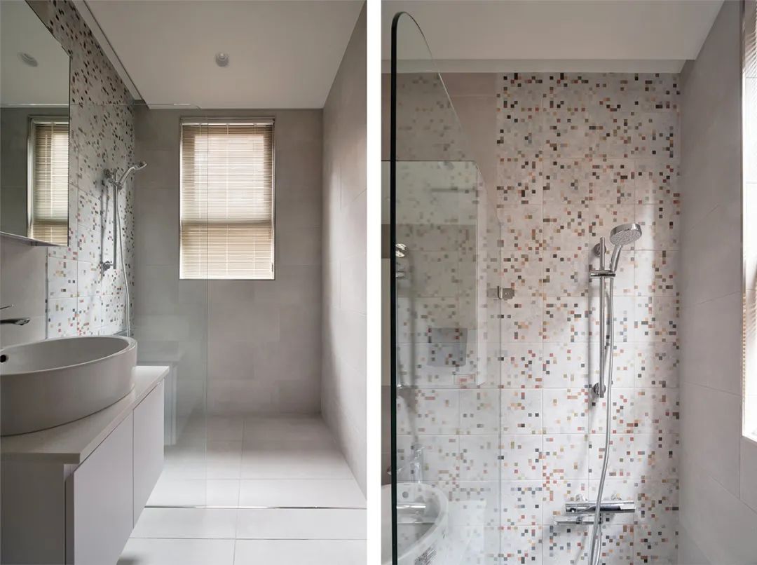 利用推拉门将洗浴区和马桶、洗手池分离开来,水不会溅到外面,更好清洁。