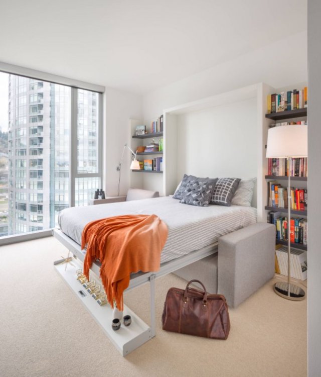 为了方便摆放下这张隐形床,我们在设计的时候就要预留好足够的空间,尺寸一定要算好~