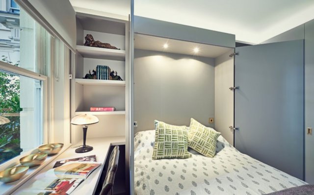 隐形床也可以侧着藏在柜子里,这样上方就可以留出足够的空间用来改造收纳。
