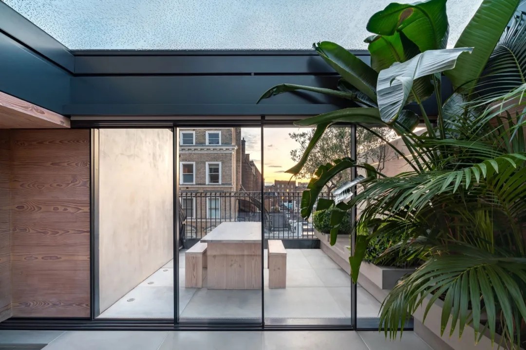 在同一层,布置简约的日光浴室种满了异国情调的植物,毗邻的露台可欣赏肯辛顿的美景,是一个田园诗般的避难所。