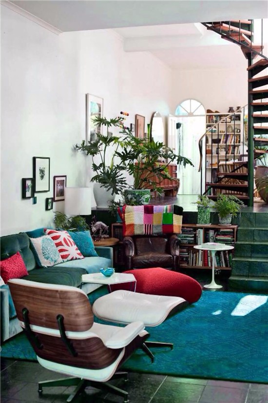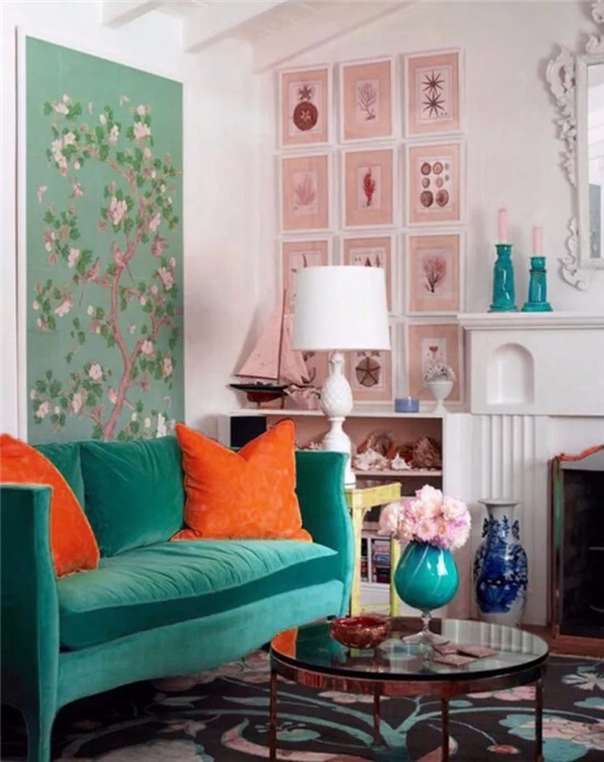你可以把电影里的灵感直接运用过来,冷色调的翠绿造成视觉上的后退感,令空间扩大而富有层次,鲜红色沙发像两朵盛放的玫瑰,热烈而醒目,整个空间在这两种色彩的碰撞下极富活力。
