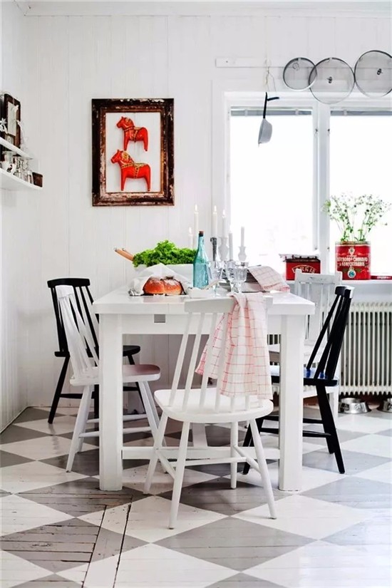餐厅铺的是木地板,但为了与它的格调相配,用乳胶漆刷出了双色菱形。红色的装饰画小马,有些做旧,中和了餐厅的白显得不失时尚感。